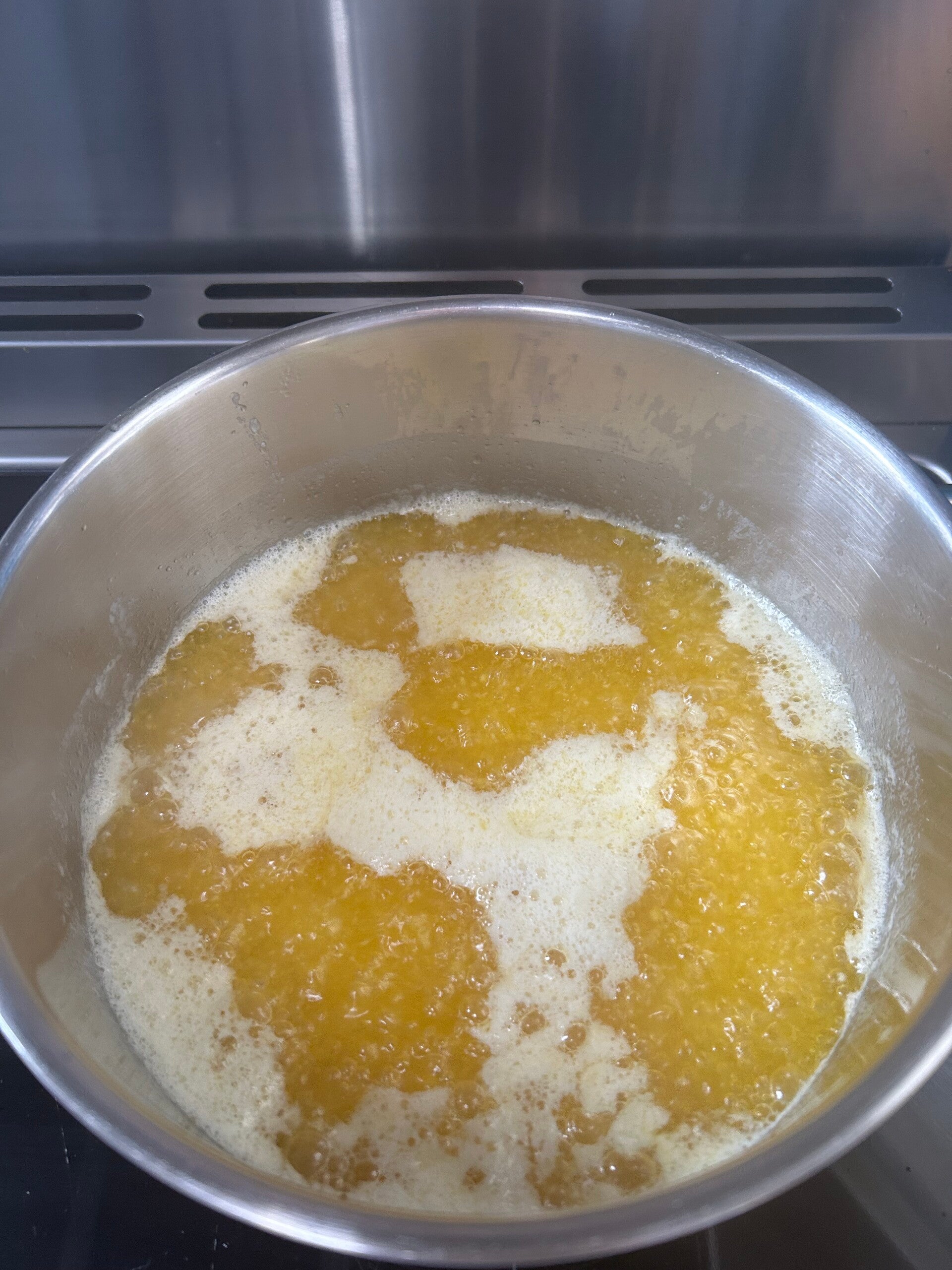 1.Melting:Place the butter in a heavy-bottomed stainless steel pot. Let it melt slowly over medium heat.